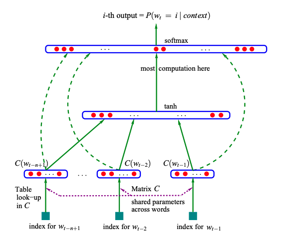 网络第一层:将 $C(w_{t-n+1}), … ,C(w_{t-2}),C(w_{t-1})$这n-1个向量首尾相接拼起来,形成一个(n-1)*m维的向量,记为输出x。