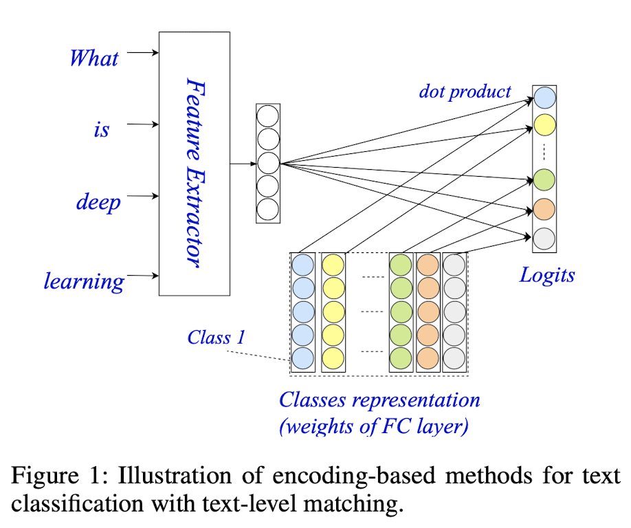 如下图所示,传统分类的解决方案通过 dot-product 操作 将文本级表示与 label 表示匹配。 在数学上,FC 层的参数矩阵可以解释为一组类表示(每个列与一个类关联)。