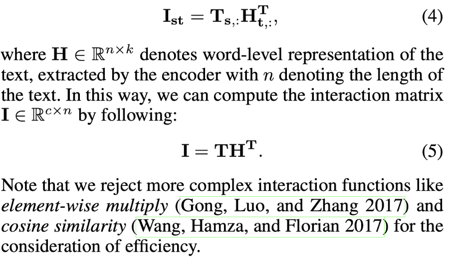 针对上述情况,作者引入了交互机制,该机制能够将单词级匹配信号纳入文本分类中。交互机制背后的关键思想是显式计算单词和类之间的匹配分数。从单词级别的表示中,它会计算一个交互矩阵,其中每个条目是单词和类(dot-product)之间的匹配得分。