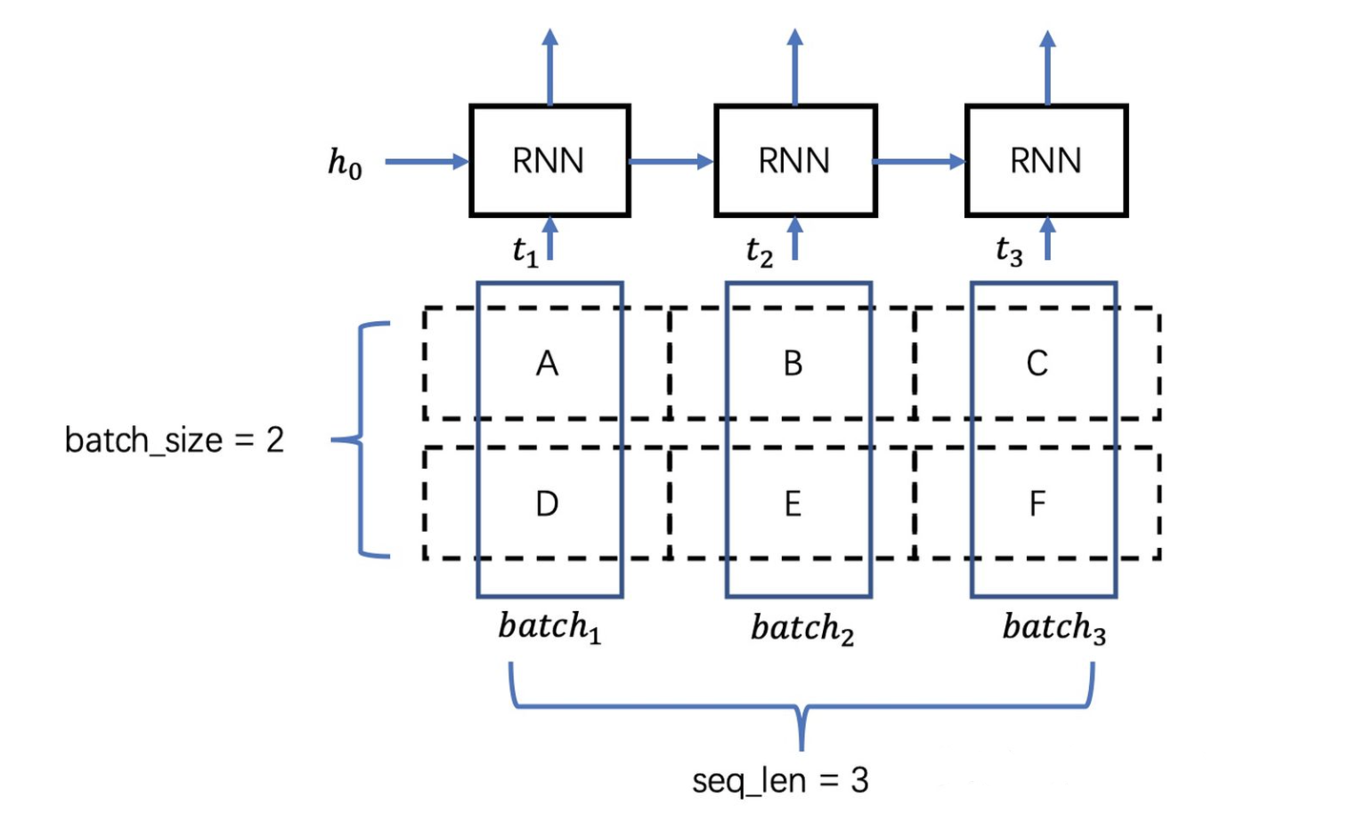 举个例子,假设输入序列的长度(seq_len)是3,batch_size是2,一个batch的数据是[[“A”, “B”, “C”], [“D”, “E”, “F”]],如下图所示。