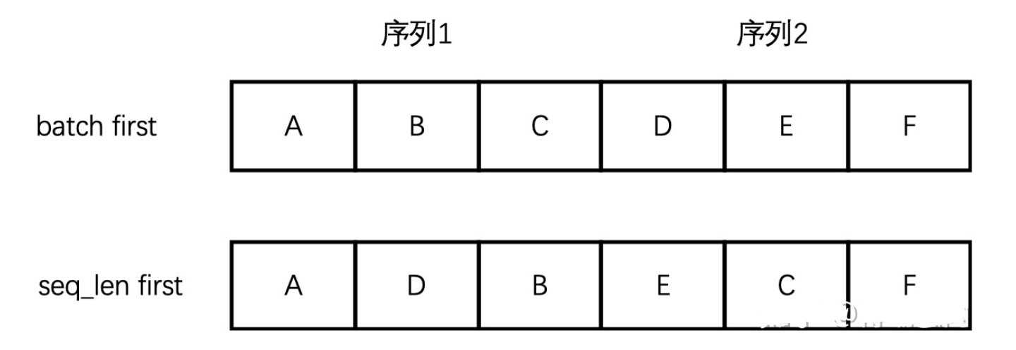 由于RNN是序列模型,只有 $t_1$ 时刻计算完成,才能进入 $t_2$ 时刻,而”batch”就体现在每个时刻 $t_i$ 的计算过程中,上图中 $t_i$ 时刻将[“A”, “D”]作为当前时刻的batch数据,$t_2$ 时刻将[“B”, “E”]作为当前时刻的batch数据,可想而知,”A”与”D”在内存中相邻比”A”与”B”相邻更合理,这样取数据时才更高效。而不论Tensor的维度是多少,在内存中都以一维数组的形式存储,batch first意味着Tensor在内存中存储时,先存储第一个sequence,再存储第二个… 而如果是seq_len first,模型的输入在内存中,先存储所有sequence的第一个元素,然后是第二个元素… 两种区别如图2所示,seq_len first意味着不同sequence中同一个时刻对应的输入元素(比如”A”, “D” )在内存中是毗邻的,这样可以快速读取数据。