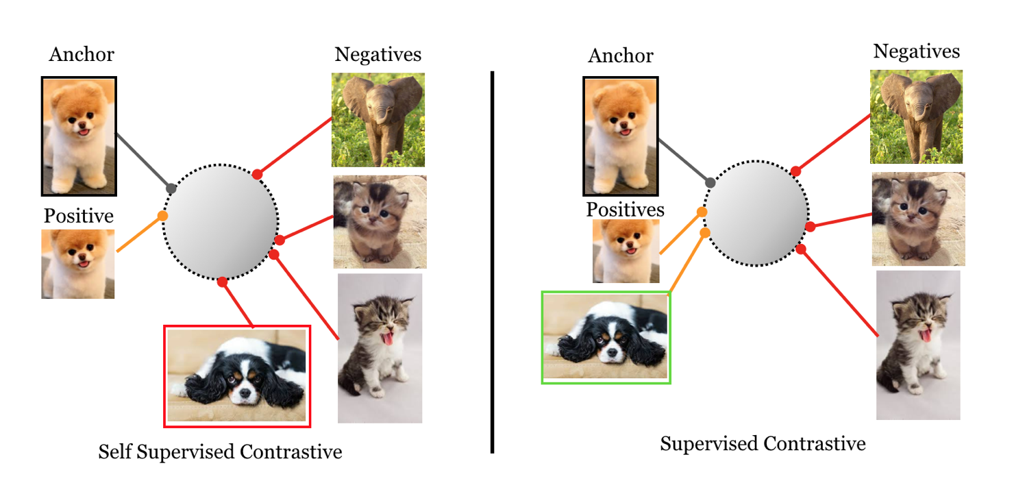 自监督学习仅仅将data augmentation得到的样本作为正样本,而在有监督的设置中,通过data augmentation得到的正样本以及与anchor标签一样的正样本都对公式中的分子有贡献。