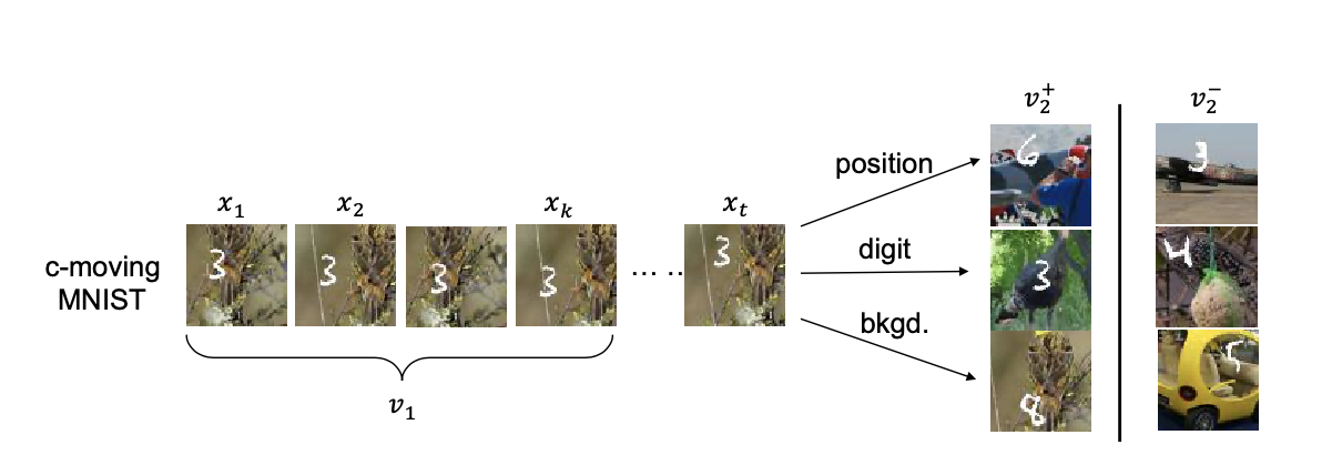 构造了一组数据集。构造两个 view 之前共享的信息分别为 (1) ”position“( $x_t$ 和 $v_2^+$ 中数字不同,背景不同,但是数字的位置相同),(2)”digit” ( $x_t$ 和 $v_2^+$ 中数字一致,其余信息都不同),(3)”background”(同理,仅background相同)。同时构造负样本 $v_2^-$ 。