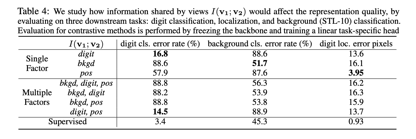 通过人为构造的数据集,可以控制两个 view 之间共享的变量。如共享 position,共享 digit,或者同时共享其中两者等。如下表,在每一对人为设置的共享变量的 view 中进行 contrastive learning,在不同的下游任务中进行评价。