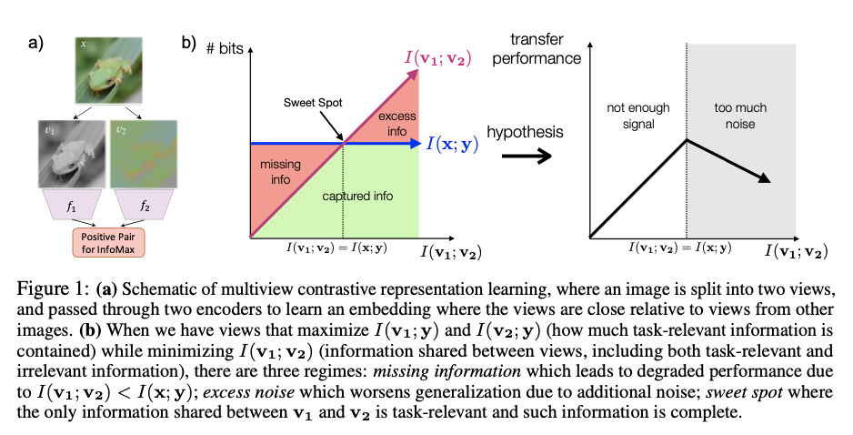 在学习过程中到达一个 sweet spot,其中 $I(v_1,v_2)=I(x,y)$ , 表明 $v_1,v_2$ 中 share 的信息量等价于数据和 label 之间的信息量。此时特征表示包含了所有的预测有关的信息,同时没有包含冗余的信息。