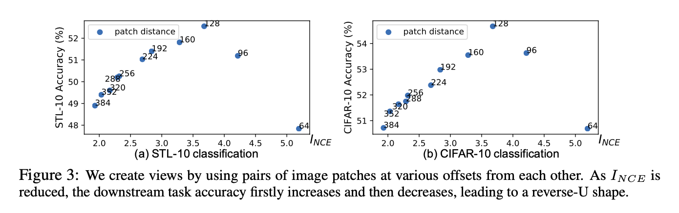 在分类任务中验证上面的想法。原始数据是图像,其中 $v_1,v-2$ 是相隔 $d$ 个像素位置提取的 patch,通过最大化 $v_1,v_2$ 的互信息来提取特征。任务 $y$ 是分类任务,在提取的特征基础上用 linear 层进行分类。可以看到,随着 pitch distance 的增大(图中从右到左),mutual-information 不断减小,在中间达到了一个 sweet spot,对下游任务具有最大的泛化能力。