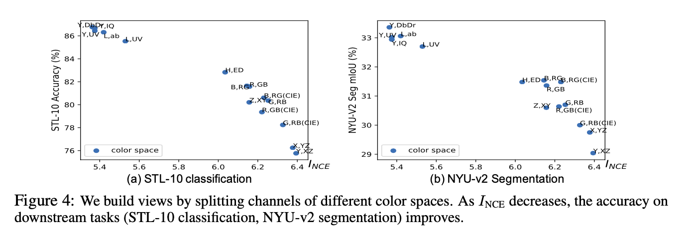 在产生 view 的 augmentation 层面可以显示 $v_1,v_2$ 的互信息。具体的,施加的augmentation越大,会导致 $v_1,v_2$ 的互信息越小,但可在后续的分类任务中产生更好的性能。